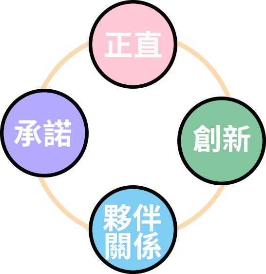 用心、正直、承諾、創新、夥伴關係。